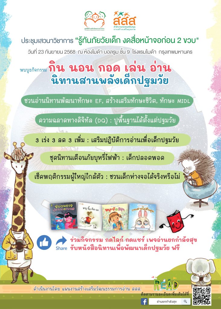 แผนงานยุทธศาสตร์สร้างเสริมวัฒนธรรมการอ่าน สสส. ร่วมออกบูธนิทรรศการ “กิน นอน กอด เล่น อ่าน นิทานสานพลังให้เด็กปฐมวัย” ในงานประชุมเสวนาวิชาการ “รู้ทันภัยวัยเด็ก งดสื่อหน้าจอก่อน 2 ขวบ” ชวนเช็คพฤติกรรมผู้ใหญ่ใกล้ตัว ชวนเด็กห่างจอได้หรือไม่ ผู้เข้าร่วมงาน ร่วมกิจกรรมในบูธ กดไลก์ กดแชร์ รับหนังสือนิทานฟรีทันที!