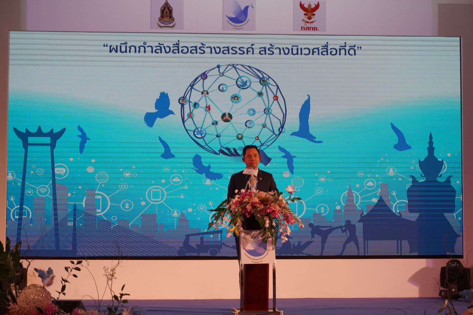 นายอิทธิพล คุณปลื้ม รัฐมนตรีว่าการกระทรวงวัฒนธรรมและรองประธานกรรมการกองทุนพัฒนาสื่อปลอดภัยและสร้างสรรค์ กล่าวว่า เวทีครั้งนี้ถือเป็นการขับเคลื่อนการพัฒนาสื่อปลอดภัยและสร้างสรรค์ในระดับจังหวัด ภูมิภาค และระดับประเทศ ในยุคการสื่อสารไร้พรมแดน ทุกคนเข้าถึงข้อมูลข่าวสารได้ทุกที่ ผ่านสื่อหลายรูปแบบ สื่อมีอิทธิพลต่อคนในสังคม และวิถีชีวิตมากขึ้น การส่งเสริมให้ประชาชนรู้เท่าทัน และมีวิจารณญาณในการบริโภคสื่อ ส่งเสริมให้เกิดสื่อสร้างสรรค์ที่เหมาะสำหรับคนทุกเพศ ทุกวัย ทุกศาสนา ทุกวัฒนธรรม จึงมีความสำคัญยิ่ง การพัฒนาสื่อปลอดภัยและสร้างสรรค์ จะไม่สามารถทำได้เลย หากปราศจากความร่วมมือ ของคนในสังคม และจากทุกภาคส่วน งานรวมพลังสื่อสร้างสรรค์สังคมไทย จึงเป็นงานสำคัญที่สร้างปรากฏการณ์การรวมตัวสื่อทุกแขนง เพื่อรวมพลังขับเคลื่อนให้เกิดสื่อปลอดภัยและสร้างสรรค์ในสังคมไทยอย่างเป็นรูปธรรม และร่วมกันขับเคลื่อนประเทศก้าวสู่สังคมแห่งการเรียนรู้สร้างสรรค์ ขับเคลื่อนให้เกิดนิเวศสื่อที่ดีทั้งในมิติการรู้เท่าทันสื่อและการมีส่วนร่วม ให้มีบทบาทเพื่อการพัฒนา และการกำกับดูแลจริยธรรมสื่อ