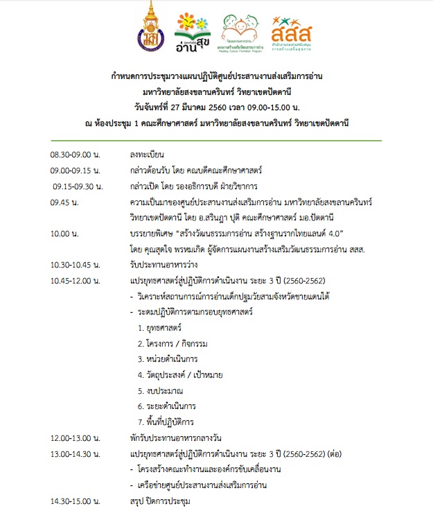 กำหนดการประชุมวางแผนปฏิบัติศูนย์ประสานงานส่งเสริมการอ่าน มหาวิทยาลัยสงขลานครินทร์ วิทยาเขตปัตตานี
