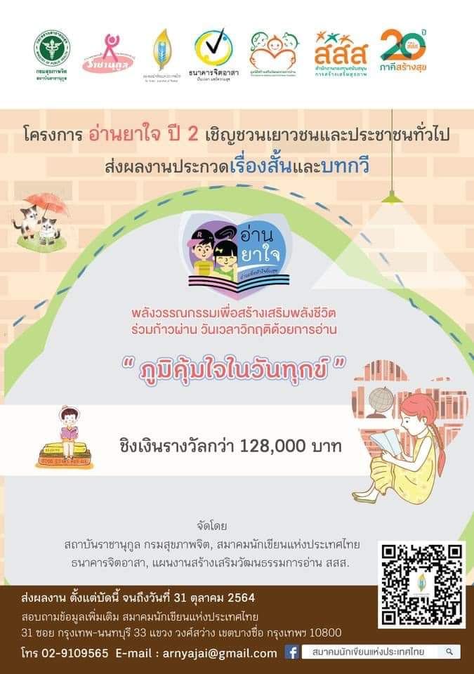 แผนงานสร้างเสริมวัฒนธรรมการอ่าน สำนักงานกองทุนสนับสนุนการสร้างเสริมสุขภาพ (สสส.) ร่วมกับกรมสุขภาพจิต กระทรวงสาธารณสุข (สธ.) สมาคมนักเขียนแห่งประเทศไทย ธนาคารจิตอาสาและเครือข่ายการ์ตูนไทยสร้างสรรค์สังคม จัดกิจกรรมเปิดตัวโครงการ “พลังวรรณกรรมเพื่อเสริมสร้างพลังชีวิต:อ่านยาใจ” ปีที่ 2 และพิธีประกาศเกียรติคุณผู้ชนะการประกวดเรื่องสั้น “วันทุกข์ที่ผ่านพ้น” ปีที่ 1 ผ่านโปรแกรม Zoom Meeting และ Live ทาง Facebook เพจ “อ่านยกกำลังสุข” ภายในงานมีการจัดเสวนาหัวข้อ จาก “วันทุกข์ที่ผ่านพ้น” สู่ “ภูมิคุ้มใจในวันทุกข์” เมื่อวันที่ 26 สิงหาคม ที่ผ่านมา