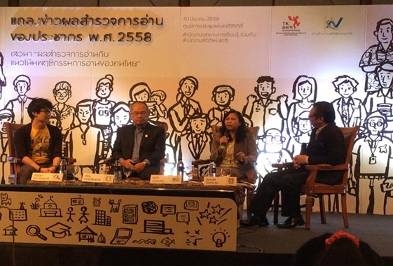 สำนักงานอุทยานการเรียนรู้ (TK park) ร่วมกับสำนักงานสถิติแห่งชาติ จัดงานแถลง “ผลสำรวจการอ่านของประชากรไทย ปี พ.ศ.๒๕๕๘” ในงาน TK Forum ในวันพุธที่ ๓๐ มีนาคม ๒๕๕๙ ณ ห้อง Meeting Room ๓-๔ ศูนย์การประชุมแห่งชาติสิริกิติ์ เพื่อเผยแพร่ข้อมูลผลสำรวจให้เกิดการรับรู้เป็นวงกว้าง ซึ่งจะช่วยกระตุ้นให้สังคมไทยตระหนักในความสำคัญของการอ่านและสร้างการมีส่วนร่วมในการสร้างกระแสให้เกิดพฤติกรรมการอ่านของคนไทย