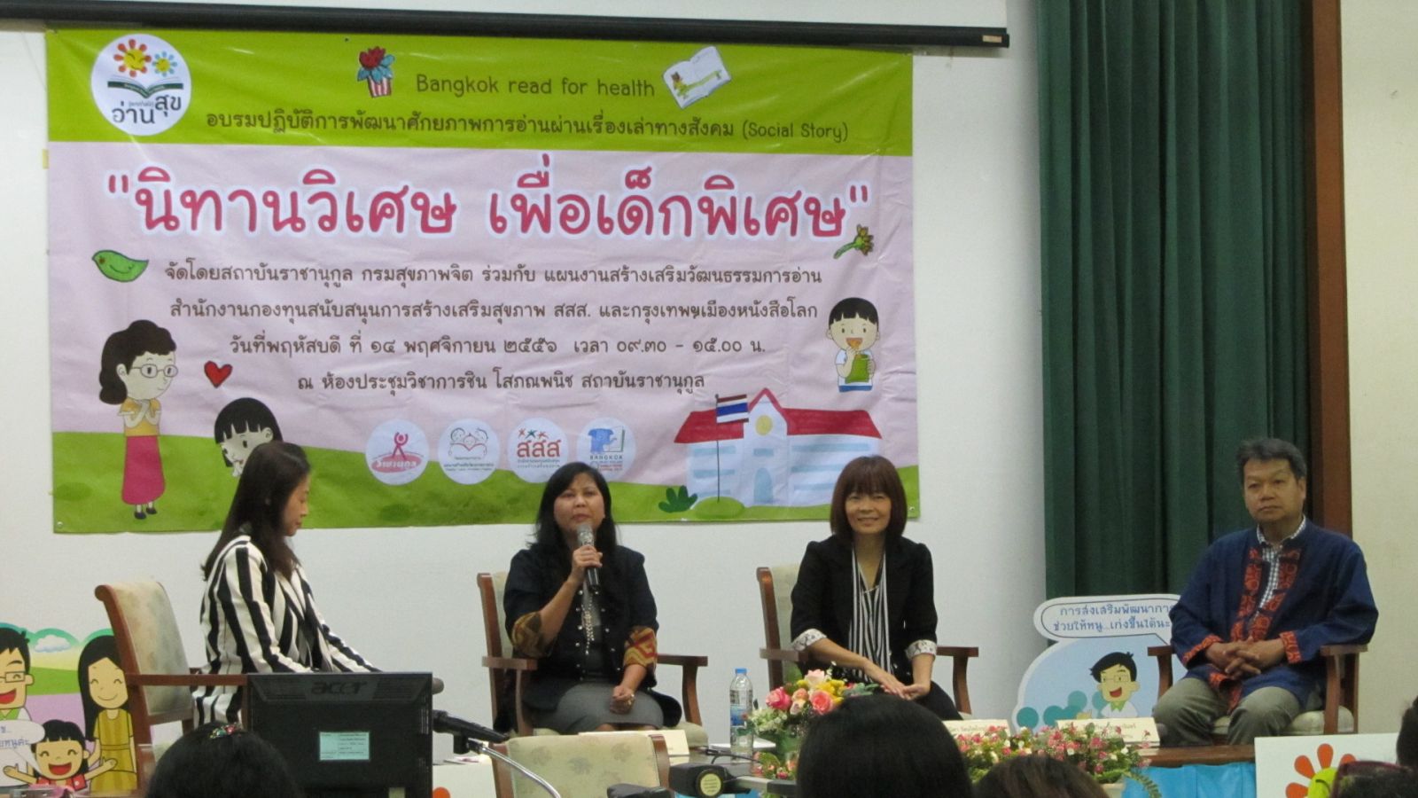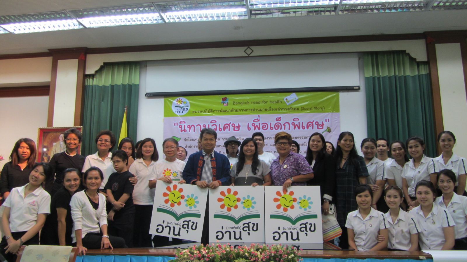 วันที่ 14 พฤศจิกายน 2556 ณ ห้องประชุมวิชาการชิน โสภณพนิช สถาบันราชานุกูล กรมสุขภาพจิต ร่วมกับ แผนงานสร้างเสริมวัฒนธรรมการอ่าน สสส. จัดงานอบรมปฏิบัติการพัฒนาศักยภาพการอ่านผ่านเรื่องเล่าทางสังคม (Social Story) นางสุดใจ พรหมเกิด ผู้จัดการแผนงานสร้างเสริมวัฒนธรรมการอ่าน สสส. กล่าว่า ที่ผ่านมาแผนงานสร้างเสริมวัฒนธรรมการอ่าน ได้รณรงค์ส่งเสริมการอ่านกับเด็กและบุคคลทั่วไป  ในการจัดงานครั้งนี้เราเห็นว่าหากจะส่งเสริมการอ่านกับเด็กพิเศษ เราต้องมีสิ่งวิเศษๆที่จะสื่อสารกับเด็ก ให้เด็กเข้าใจตนเอง เข้าใจคนรอบข้าง เพื่อเสริมพฤติกรรมที่เหมาะสม  เนื่องมาจากวันที่ 8 พฤศจิกายน 2556 ถือเป็นวันครบรอบปีที่ 12 แห่งการก่อตั้งสำนักงานกองทุนสนับสนุนการสร้างเสริมสุขภาพ (สสส.) แผนงานสร้างเสริมวัฒนธรรมการอ่าน จึงได้สนับสนุนรณรงค์ให้เดือนพฤศจิกายนเป็นเดือนแห่งการสร้างเสริมสุขภาวะ  ผ่านกระบวนการและกิจกรรมสนับสนุนการอ่านกับเด็ก ครอบครัว ชุมชน โรงเรียนสถาบันการศึกษา หน่วยงานด้านสุขภาพ รวมถึง ผู้ผลิตผู้จำหน่ายหนังสือที่เกี่ยวเนื่องกับสุขภาวะในด้านต่างๆภายใต้ชื่อโครงการ NovemberBangkok-Read for Heath :อ่าน (ยกกำลัง)สุขเพื่อสร้างกระบวนการมีส่วนร่วมของบุคคลากร ชุมชน และ หน่วยงานต่างๆ ในการสร้างเสริมวัฒนธรรมการอ่านเพื่อสุขภาวะใน 4 มิติ ทั้งกาย ใจ สังคมและปัญญา  และร่วมหนุนเสริมกรุงเทพมหานครในวาระกรุงเทพฯเมืองหนังสือโลก  การอบรมปฏิบัติการพัฒนาศักยภาพการอ่านผ่านเรื่องเล่าทางสังคม (Social story) “นิทานวิเศษ เพื่อเด็กพิเศษ” เป็นหนึ่งในกิจกรรมที่สำคัญของโครงการอ่านยกกำลังสุขเพื่อหนุนให้เกิดเครือข่ายผู้ปกครองที่มีความรู้ความสามารถในการใช้สื่ออ่านเพื่อพัฒนาลูกที่มีความต้องการพิเศษได้ด้วยตนเอง