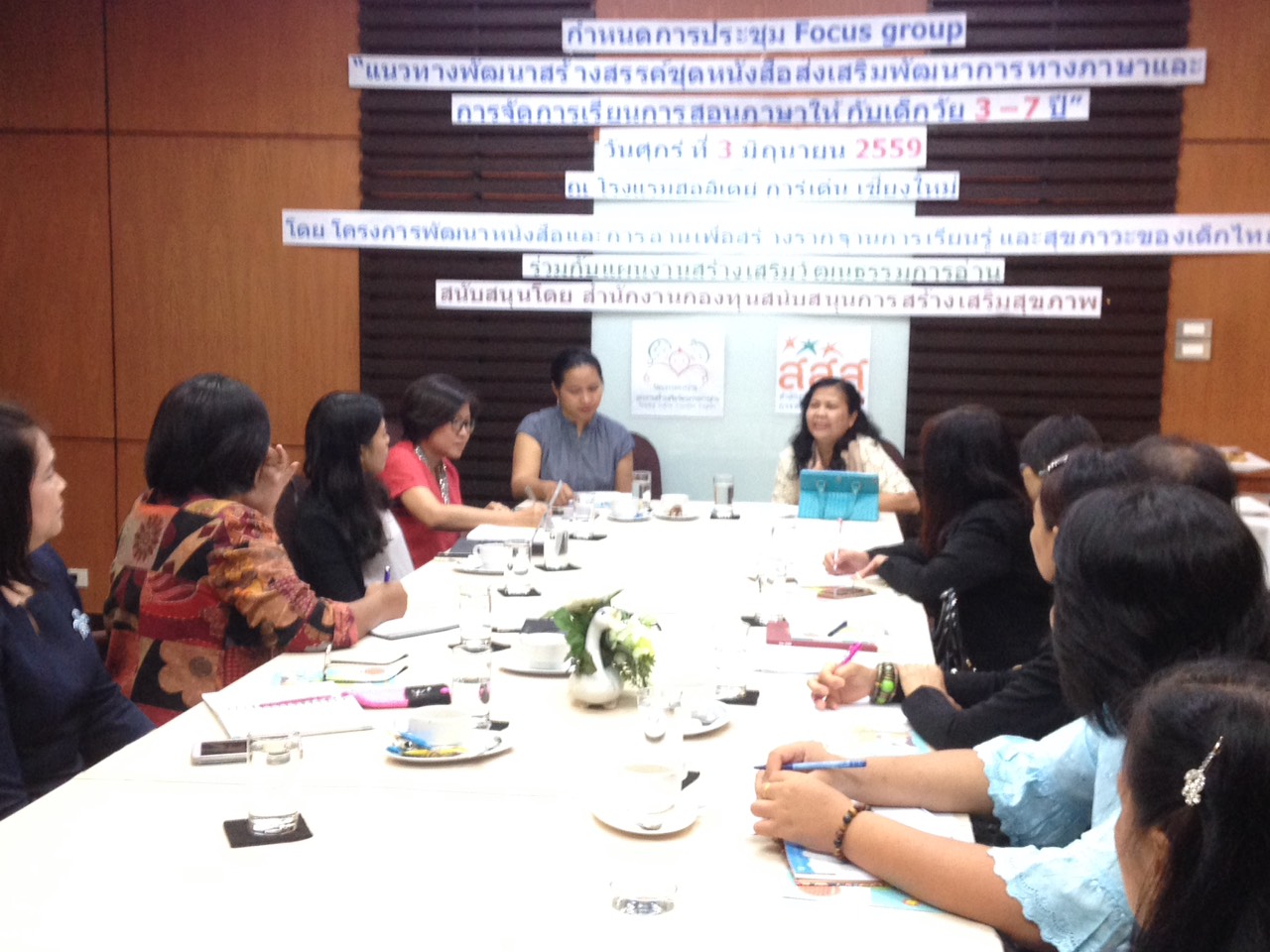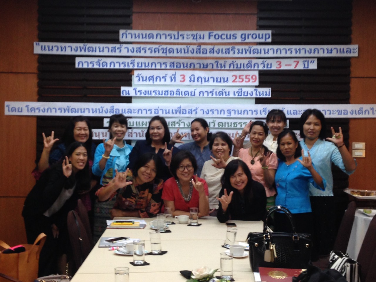 แผนงานสร้างเสริมวัฒนธรรมการอ่าน ร่วมกับโครงการพัฒนาหนังสือและการอ่านเพื่อสร้างรากฐานการเรียนรู้และสุขภาวะของเด็กไทย จัดประชุม Focus group "แนวทางพัฒนาสร้างสรรค์ชุดหนังสือส่งเสริมพัฒนาการทางภาษาและการจัดการเรียนการสอนภาษาให้กับเด็กวัย 3-7 ปี" พื้นที่นำร่องจังหวัดเชียงใหม่ วันที่ 3 มิถุนายน 2559 ณ โรงแรมฮอลิเดย์ การ์เด้นท์ เชียงใหม่