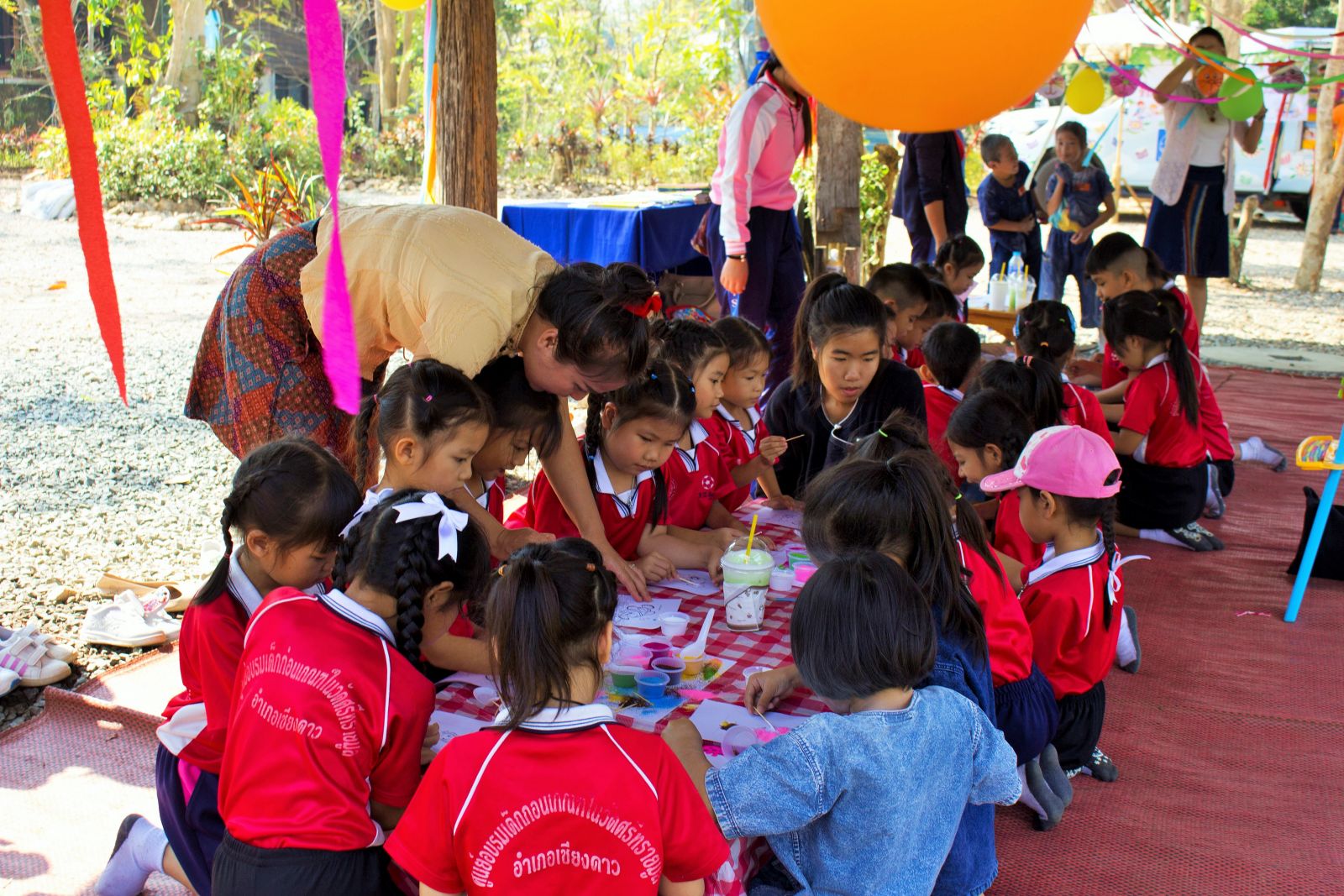 ด้านครูไก่ กนกพิชญ์ มณี ครูอนุบาลโรงเรียนบ้านปางแดง เล่าว่า “ วันนี้กิจกรรมหลักที่นำมาจัดให้เด็ก ๆ ได้สนุกคือ การเล่านิทานจากภาพ เพราะเขาจะได้ฝึกความคิดสร้างสรรค์ แต่ก็กลัวเด็กไม่ชอบ เลยจัดโต๊ะไว้ให้เด็กได้ระบายสีภาพสวยลายการ์ตูนจากทรายสี ซึ่งเด็ก ๆ ชอบมากกว่ากิจกรรมหลักเสียอีก ทำให้รู้ว่า ทรายสี ๆที่จัดสวนก็นำมาสร้างสรรค์กิจกรรมให้เด็ก ๆ เล่นได้ด้วย ” ทั้งเล่าเสริมว่า “เดินดูซุ้มกิจกรรมของโรงเรียนอื่น ๆ ก็ทำให้รู้ว่า เด็ก ๆ ชอบอะไร ไม่ชอบอะไร อย่างเป่าแป้ง เห็นเลยว่าเขาชอบมาก และกิจกรรมสอนเด็กทำผ้ามัดย้อม ซึ่งเราสอนเขาได้แล้ว แต่ต้องระมัดระวังเท่านั้นเอง”