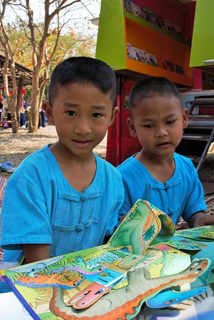 วิว ใหม่ชินลักษณ์ อุทัย และเพื่อน สารัตน์ ลุงวิ วัย 6 ขวบนักเรียนอนุบาลโรงเรียนบ้านทุ่งหลุก นั่งเปิดดูหนังสือนิทานป๊อบอัพเรื่อง ไดโนเสาร์ ของห้องสมุดรังไหมอย่างชอบใจและบอกว่า “ ผมชอบหนังสือแบบนี้มาก มันมีตัวไดโนเสาร์โผล่ออกมาด้วย อยากให้โรงเรียนมีหนังสืออย่างนี้เยอะๆ เพราะผมชอบไดโนเสาร์มากด้วยครับ”