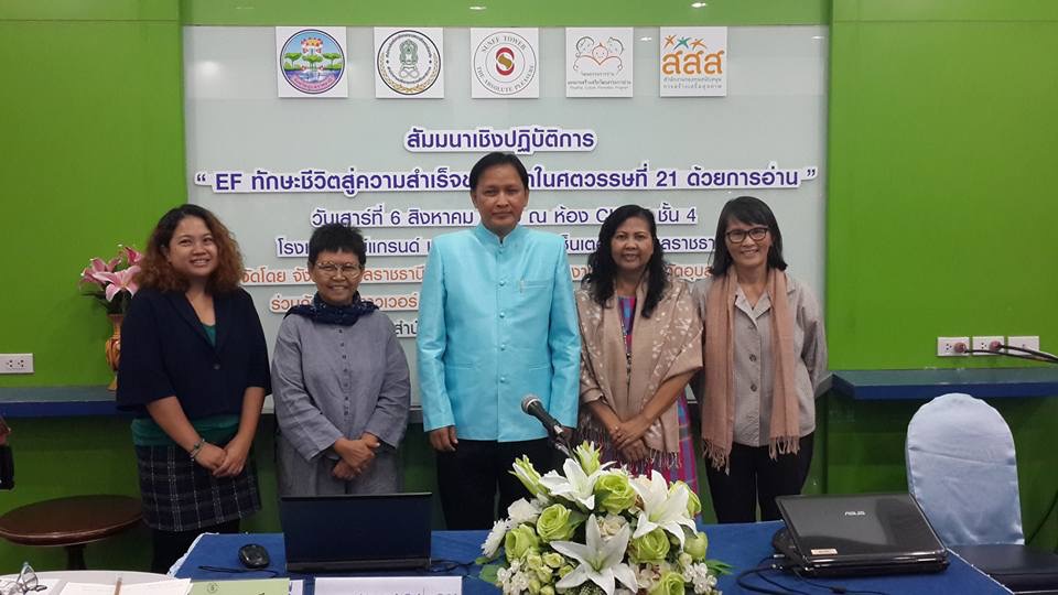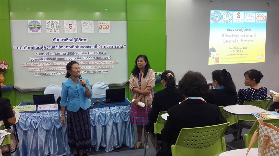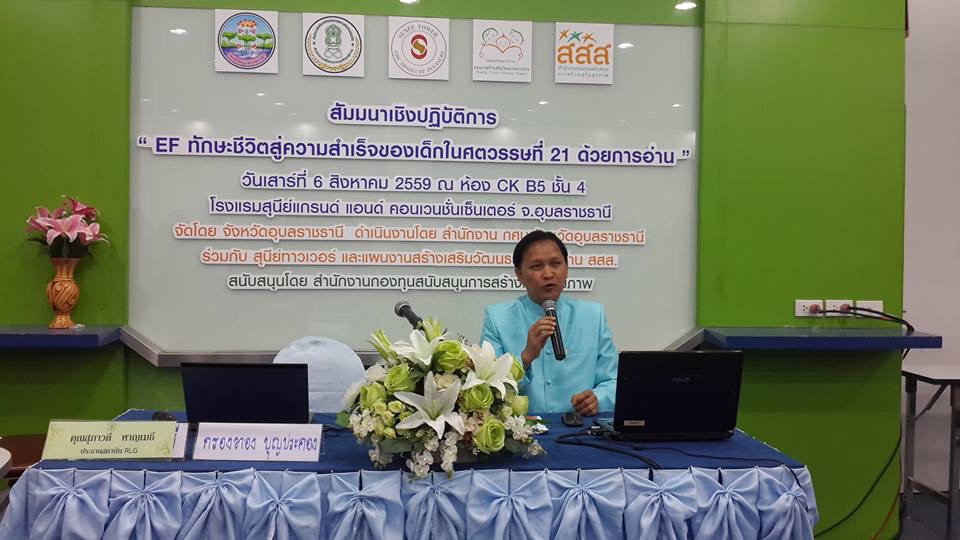 อุบลราชธานี 6 สิงหาคม 2559 — แผนงานสร้างเสริมวัฒนธรรมการอ่าน สสส. จัดสัมมนาเชิงปฏิบัติการ “EF ทักษะชีวิตสู่ความสำเร็จของเด็กในศตวรรษที่ 21 ด้วยการอ่าน” ในเวทีสร้างเสริมวัฒนธรรมการอ่านภูมิภาค “อ่านเพื่อแม่ : มหกรรมเลี้ยงลูกด้วยหนังสือ” โดยจัดขึ้นในงานสัปดาห์หนังสือและการเรียนรู้ “อ่านเพื่อรู้สู่อุบลราชธานีนครแห่งการอ่าน” หวังให้พ่อแม่ ครูปฐมวัย บุคลากรทางการแพทย์ ใช้การอ่านเป็นเครื่องมือสำคัญในการพัฒนาทักษะ EF และร่วมเรียนรู้ความลับของสมอง และกุญแจสำคัญในการพัฒนาเด็กปฐมวัย โดยวิทยากรผู้เชี่ยวชาญ คุณสุภาวดี หาญเมธี ประธานสถาบัน RLG ณ ห้อง CKB 5 ชั้น 4 โรงแรมสุนีย์ แกรนด์โฮเทล แอนด์ คอนเวนชั่น เซ็นเตอร์ จ.อุบลราชธานี