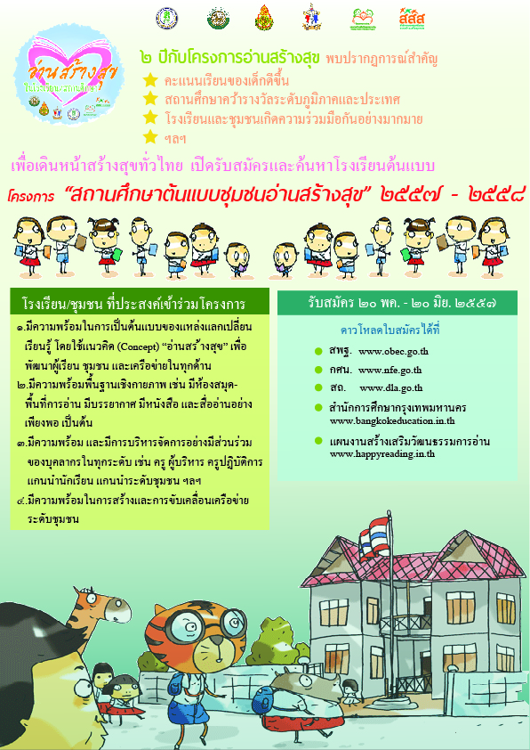 แผนงานสร้างเสริมวัฒนธรรมการอ่าน ร่วมกับสำนักงานคณะกรรมการการศึกษาขั้นพื้นฐาน (สพฐ.) กระทรวงศึกษาธิการ สำนักงานส่งเสริมการศึกษานอกระบบและการศึกษาตามอัธยาศัย (กศน.) กรมส่งเสริมการปกครองส่วนท้องถิ่น (สถ.) และสำนักการศึกษากรุงเทพมหานคร ร่วมกันค้นหาโรงเรียนที่มีศักยภาพในการเป็นโรงเรียนต้นแบบส่งเสริมการอ่าน และสร้างการมีส่วนร่วมจากชุมชนและภาคีต่างๆ เข้ามามีส่วนร่วม ภายใต้โครงการ “สถานศึกษาต้นแบบชุมชนอ่านสร้างสุข” ปีการศึกษา ๒๕๕๗ เพื่อหนุนเสริมให้เกิดสถานศึกษาต้นแบบที่ใช้แนวคิด “อ่านสร้างสุข” พัฒนาศักยภาพผู้เรียนในทุกด้าน รวมถึงบุคลากรในสถานศึกษา ครอบครัว และชุมชน ร่วมกันสร้างสังคมสุขภาวะ