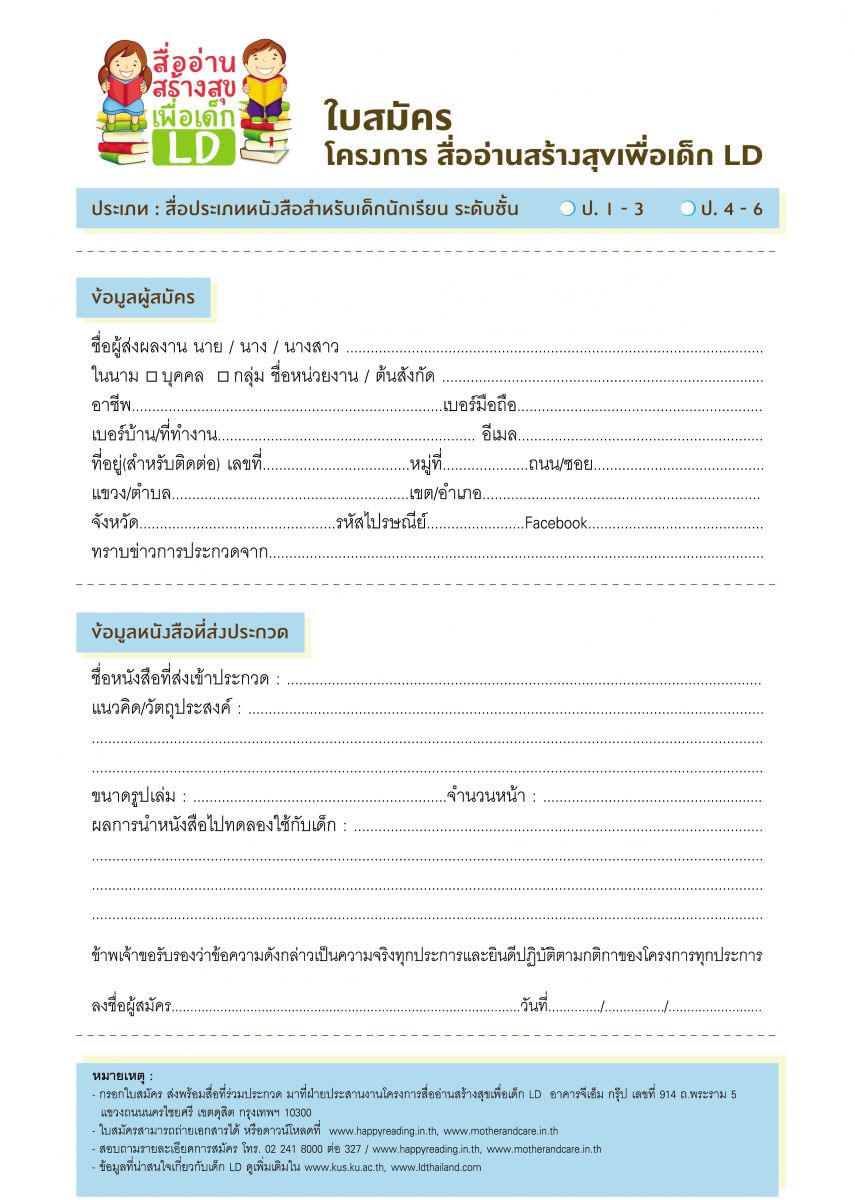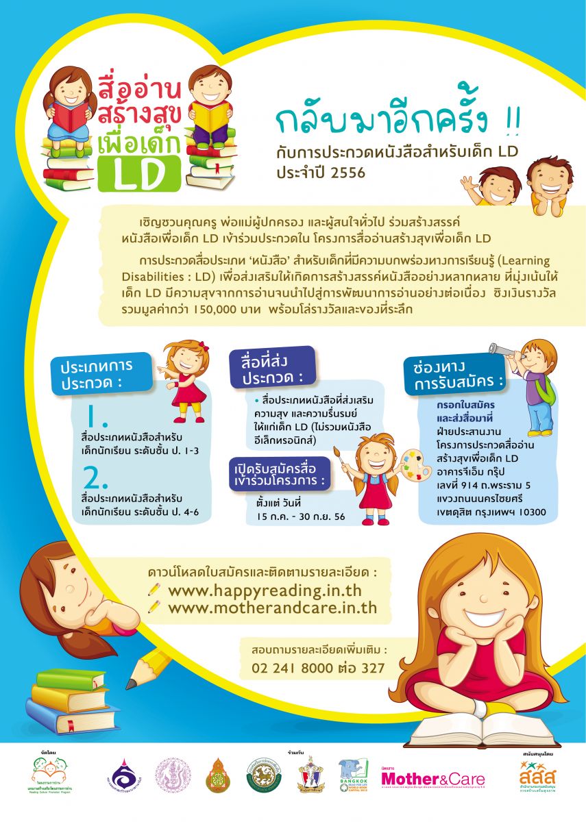 แผนงานสร้างเสริมวัฒนธรรมการอ่าน สสส. และภาคีเครือข่าย เชิญชวนคุณครู พ่อแม่ผู้ปกครอง และผู้สนใจทั่วไป ส่งผลงานเข้าร่วมประกวดในโครงการ " สื่ออ่านสร้างสุขสำหรับเด็ก LD" ประจำปี 2556 เพื่อกระตุ้นและสร้างเสริมให้เกิดการสร้างสรรค์หนังสือที่ส่งเสริมพัฒนาการตามวัย ชิงเงินรางวัลกว่า 150,000 บาท พร้อมโล่รางวัลและของที่ระลึก เริ่มส่งผลงานได้ตั้งแต่ 15 ก.ค. – 31 ก.ย. 2556 นี้ รายละเอียดเพิ่มเติมโทร 02-241-8000 ต่อ 327