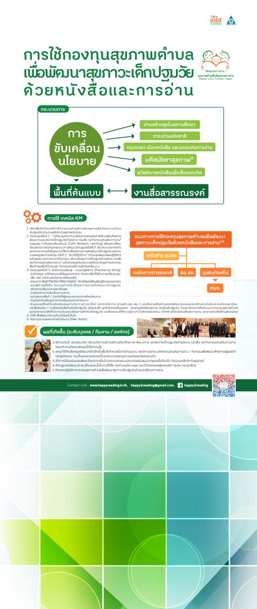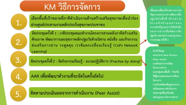 แผนงานสร้างเสริมวัฒนธรรมการอ่าน นำโดย คุณสุดใจ พรหมเกิด ผู้จัดการแผนงานการอ่านฯ พร้อมคณะเจ้าหน้าที่ ร่วมกระบวนการนำเสนอการจัดการความรู้ (KM Knowledge) ประเด็น “การใช้กองทุนสุขภาพตำบลเพื่อพัฒนาสุขภาวะเด็กปฐมวัย ด้วยหนังสือและการอ่าน” โดยผ่านกระบวนการการใช้เทคนิค KM พร้อมนำเสนอนิทรรศการเครื่องมือสนับสนุนและสาธิตการใช้เครื่องมือที่เป็นรูปธรรม ให้แก่องค์กรที่เข้าร่วมแลกเปลี่ยน รวมกว่า 120คน จากกว่า 50หน่วยงาน