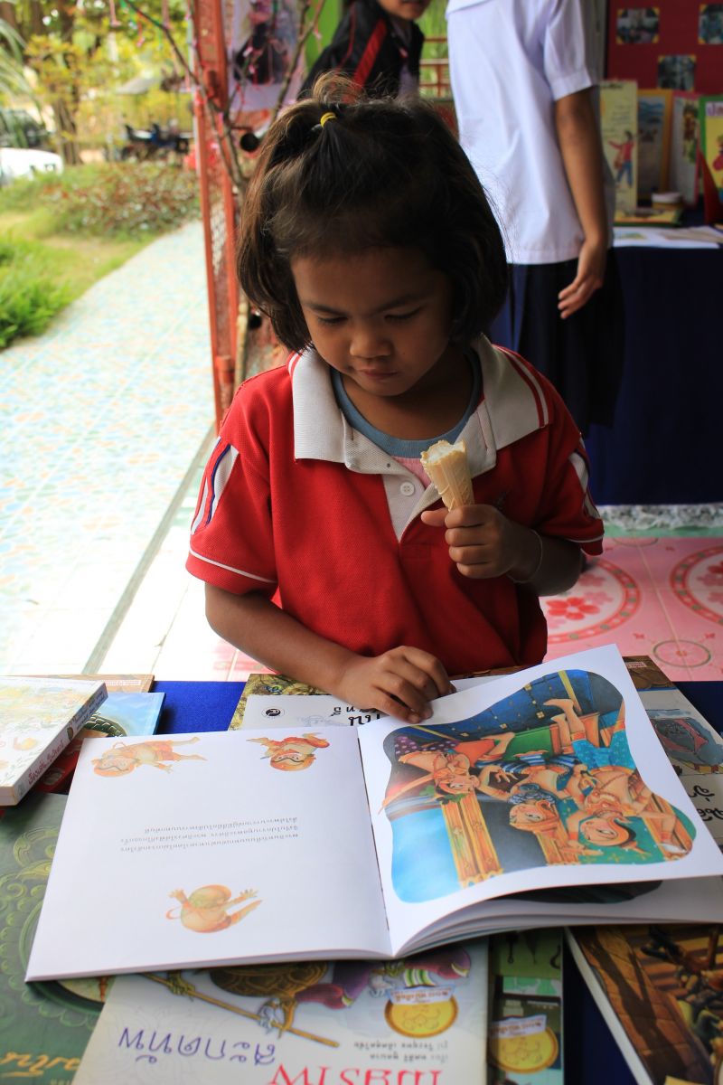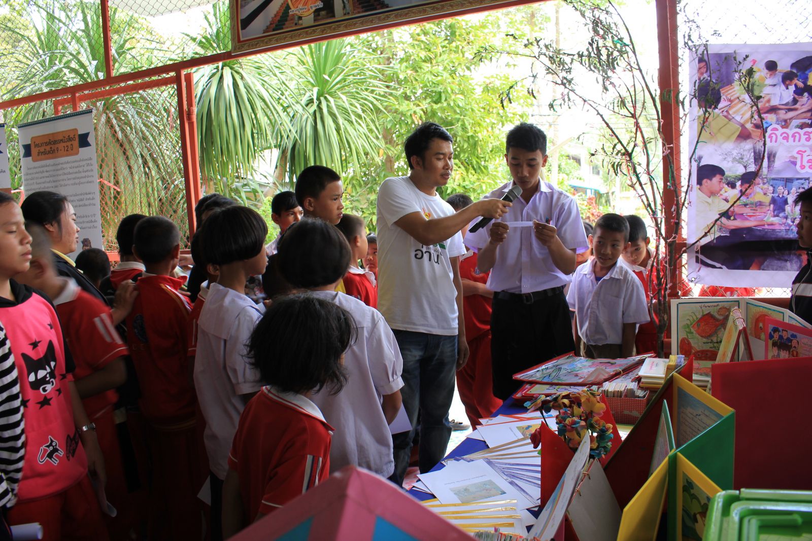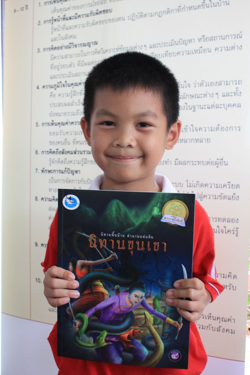 ส่วน เด็กชายภูมิประภา ศรีพรม นักเรียนชั้นประถมศึกษาปีที่ 2 โรงเรียนบ้านเอราวัณ ที่มาเล่านิทานเรื่อง นิทานขุนเขา ให้ฟังอย่างตั้งใจ ด้วยลีลาที่เกินกว่าเด็ก 8 ขวบ จากการสอบถามน้องภูมิ ก็ได้ความว่า น้องภูมิชอบอ่านหนังสือนิทาน ยืมหนังสือมาอ่านบ้าง ส่วนเล่มไหนสนใจก็จะขอคุณแม่ชื้อมาเก็บไว้อ่าน และซุ้มที่สนใจมากที่สุดก็คือซุ้มของแผนงานฯ เพราะมีหนังสือนิทานมากมายให้ได้เลือกอ่านอย่างเต็มที่