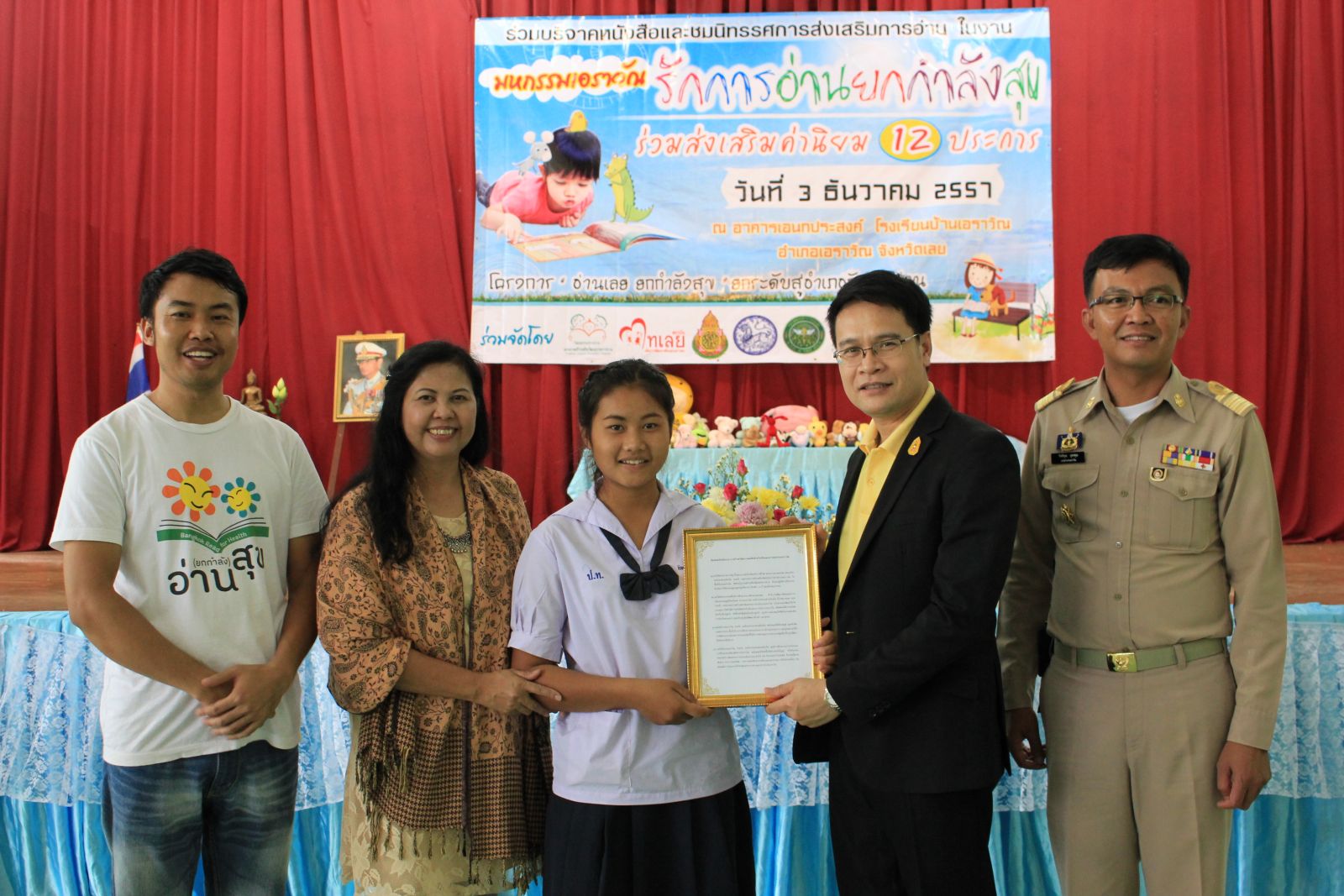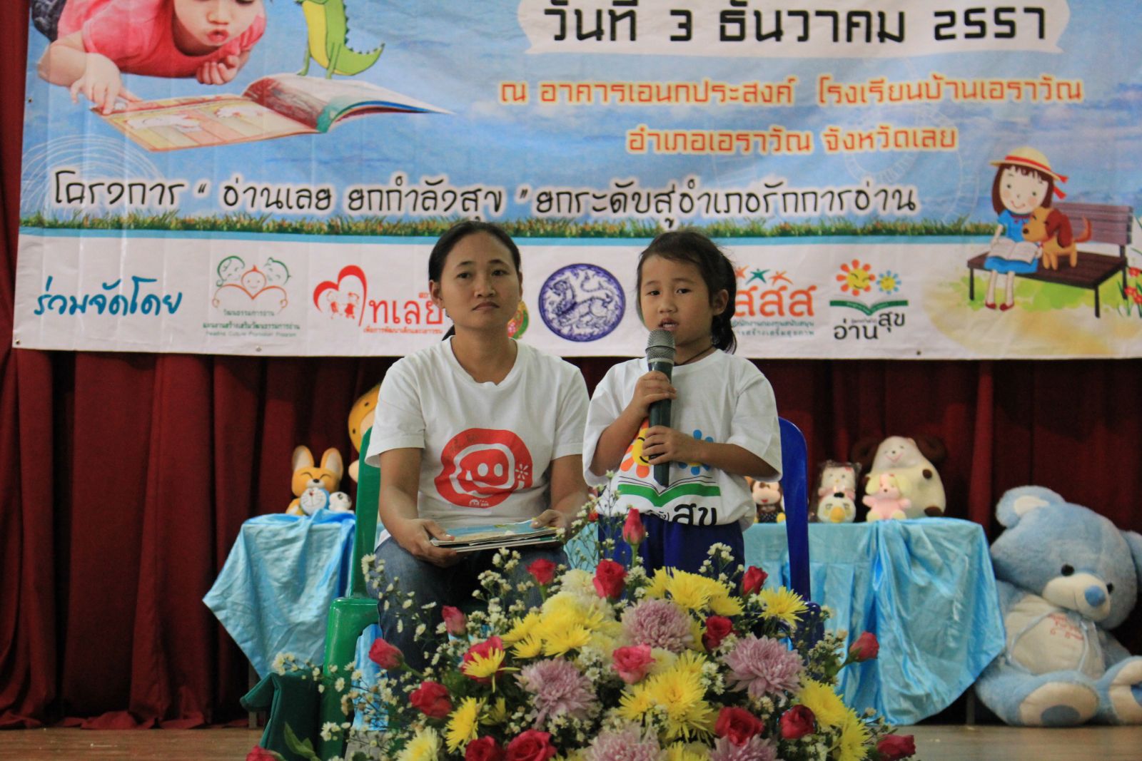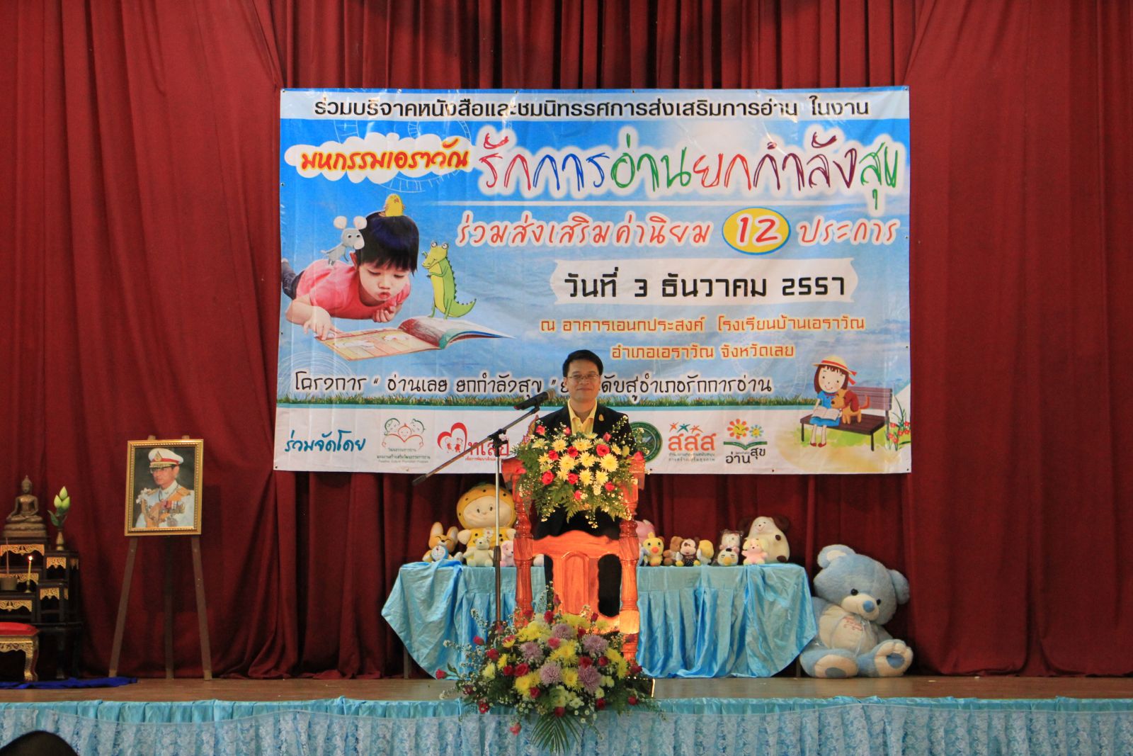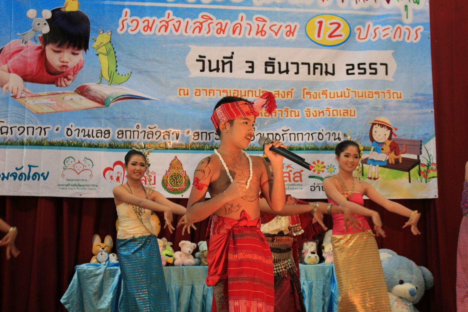 เมื่อวันที่ 3 ธันวาคม 2557 แผนงานสร้างเสริมวัฒนธรรมการอ่าน สสส. สถาบันไทเลยเพื่อการพัฒนาเด็กและเยาวชน ร่วมกับ องค์กรภาคีเครือข่าย จัดงาน“มหกรรมเอราวัณ รักการอ่านยกกำลังสุข ร่วมส่งเสริมค่านิยม 12 ประการ” ณ โรงเรียนบ้านเอราวัณ อำเภอเอราวัณ จังหวัดเลย ได้รับเกียรติจาก ผู้อำนวยการสำนักงานเขตพื้นที่การศึกษาประถมศึกษาเลย เขต 2 นายสุภชัย จันปุ่ม เป็นประธานในพิธีเปิด ภายในงานมีการแสดงนิทรรศการและกิจกรรมต่างๆของภาคีเครือข่าย โดยเริ่มจากชุดการแสดงของเด็กนักเรียนโรงเรียนบ้านเอราวัณ ต่อด้วยการเล่านิทานของน้องปองวัย 4 ขวบ จากนั้น  ตัวแทนเด็กและเยาวชนอำเภอเอราวัณและตัวแทนนักเรียน 10 โรงเรียน กล่าวปฏิญาณค่านิยม 12 ประการ และมอบข้อเสนอเชิงนโยบายการสร้างสวัสดิการหนังสือสำหรับเด็กและเยาวชน ให้กับผู้อำนวยการสำนักงานเขตพื้นที่การศึกษาประถมศึกษาเลย เขต๒