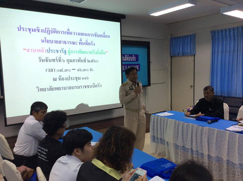 ตรัง : 6 มกราคม 2560 วันจันทร์ ที่ 6 มกราคม 2560 เครือข่ายสมาชิกสมัชชาสุขภาพจังหวัดตรัง ร่วมกับสำนักงานจังหวัดตรัง วิทยาลัยพยาบาลบรมราชชนนี จัดการประชุมเชิงปฏิบัติการเพื่อวางแผนการขับเคลื่อนนโยบายสาธารณะ พื้นที่ตรัง "สานพลังประชารัฐ สู่การพัฒนาตรังที่ยั่งยืน" ณ ห้องประชุม 116 ตึกอำนวยการ วิทยาลัยพยาบาลบรมราชชนนีตรัง เพื่อร่วมกันทบทวนทิศทาง เป้าหมาย และกลไก การขับเคลื่อนนโยบายสาธารณะพื้นที่ตรัง ตลอดจนการสร้างเสริมสุขภาวะเด็กปฐมด้วยการบูรณาการอย่างมีส่วนร่วม โดยมีนายสายัณห์ อินทรภักดิ์ รองผู้ว่าราชการจังหวัดตรัง เป็นประธานเปิดการประชุม โดยผู้เข้าร่วมประชุมประกอบด้วย ตัวแทนจากหน่วยงานราชการ ภาคองค์กรธุรกิจ และภาคประชาสังคม กว่า 120 ท่าน