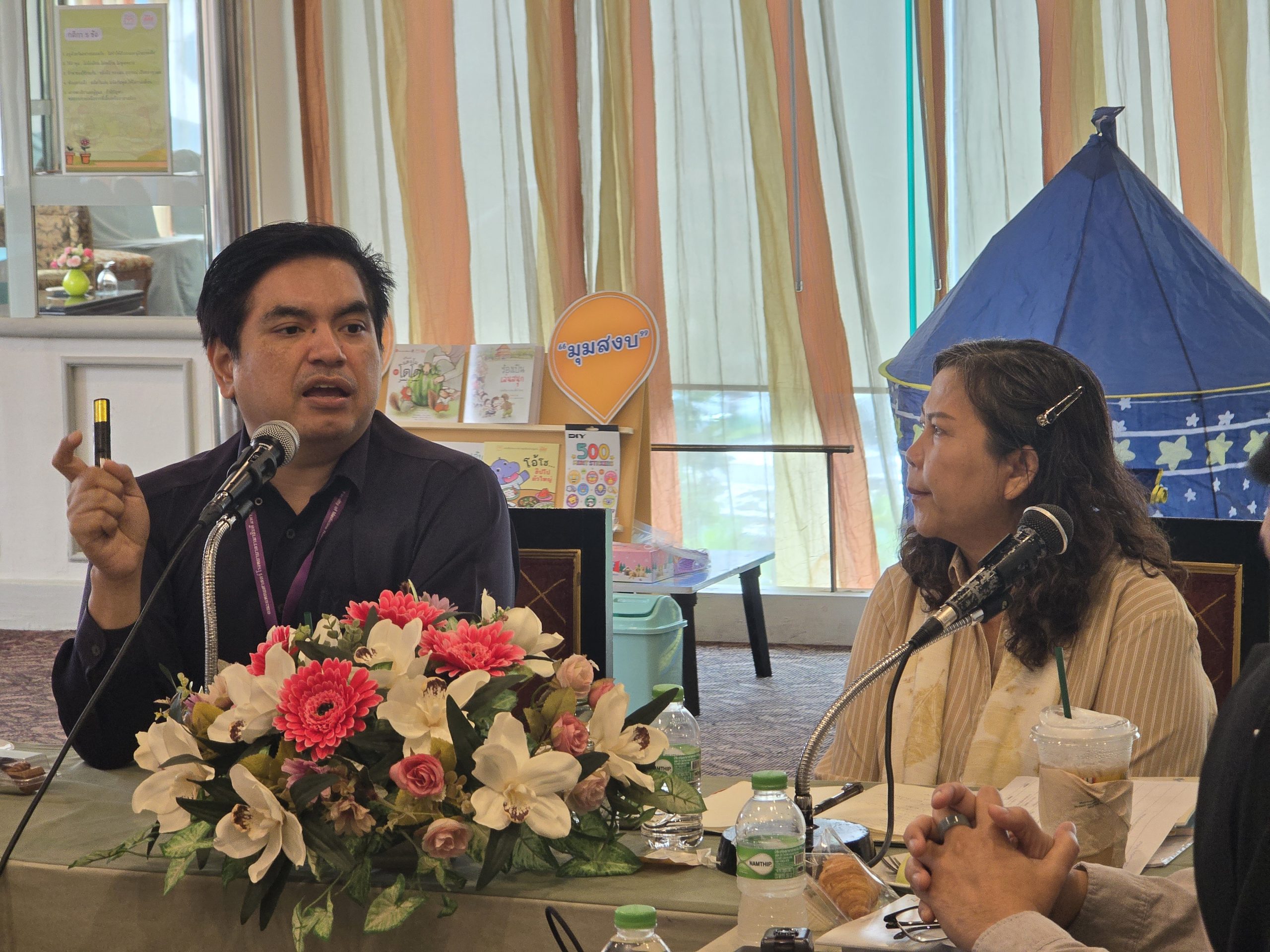 ด้าน รศ.นพ.เทอดพงศ์ ทองศรีราช ภาควิชากุมารเวชศาสตร์ คณะแพทยศาสตร์ โรงพยาบาลรามาธิบดี มหาวิทยาลัยมหิดล ได้นำเสนอข้อมูลการศึกษา “มุมสงบ 1 x 1 เมตร เพื่อการฟื้นฟู เยียวยา และพัฒนาเด็กในสถานการณ์ที่เปราะบาง” ด้วยเหตุการณ์ความไม่สงบบริเวณชายแดนไทย-กัมพูชา ทำให้เด็กๆ ในพื้นที่ดังกล่าว ประสบภาวะหวาดกลัว ความเครียดจากการพรากจาก การสูญเสีย ฯลฯ ส่งผลกระทบต่อพัฒนาการ อารมณ์ จิตใจ จิตสังคม ซึ่งเป็นรากฐานสำคัญของการเติบโตอย่างมั่นคงของเด็ก ข้อสังเกตจากประสบการณ์ทตรงพบว่า ภาวะวิกฤตจะเป็น Risk หรือ Resilience กับเด็กปฐมวัยได้ จากการช่วยเหลือและการสนับสนุนจากบริบทแวดล้อม นำมาสู่แนวคิดของการพัฒนาหนังสือวิชาการ อ่านสร้างสุข ปลูกกล้ากลางไฟ : แนวทางการดูแลจิตใจและเลี้ยงดูเด็กในภาวะสงครามโดยมี หัวใจสำคัญ เพื่อดึงสมองให้ลงมาอยู่ในภาวะปกติ หากสมองอยู่ในภาวะที่จะสู้หรือจะหนี จะนำไปสู่ความถดถอยทางการเรียนรู้ lost generation ของเด็ก