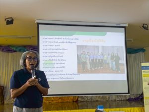 นางมลฑา เข้มพิมพ์ ผู้รับผิดชอบโครงการฯ ได้นำเสนอผลการดำเนินโครงการวิจัย “การส่งเสริมการเรียนรู้ของเด็กปฐมวัยด้วยการอ่านนิทานอย่างมีส่วนร่วมของครอบครัว ในตำบลทุ่งควายกิน อ.แกลง จ.ระยอง” ที่แม้จะดำเนินงานในกลุ่มเป้าหมายที่เป็นครอบครัวเปราะบางแต่ยังเห็นความสำเร็จของการใช้หนังสือนิทานเป็นเครื่องมือเชื่อมสัมพันธ์และพัฒนาทักษะเด็กปฐมวัยได้ด้วยการมีส่วนร่วมของคนในครอบครัว และการออกแบบการทำงานอย่างเหมาะสมกับกลุ่มเป้าหมาย