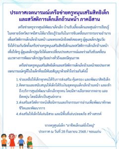 แผนงานฯ การอ่าน สสส. เปิดตัวพลังเครือข่ายครูหนุนเสริมสิทธิเด็กและสวัสดิการเด็กเล็กถ้วนหน้าภาคอีสาน พร้อมร่วมประกาศเจตนารมณ์ครูดีในใจเด็ก ติดตาม ช่วยเหลือ คุ้มครอง ส่งเสริม และเปิดพื้นที่พัฒนาเด็กปฐมวัย ให้เข้าถึงสวัสดิการสำคัญ อาทิ เงินอุดหนุนเด็กเล็กถ้วนหน้า สวัสดิการหนังสือ 3 เล่มในบ้านเด็ก พื้นที่เล่นอิสระที่ปลอดภัยและสร้างสรรค์ ฯลฯ
