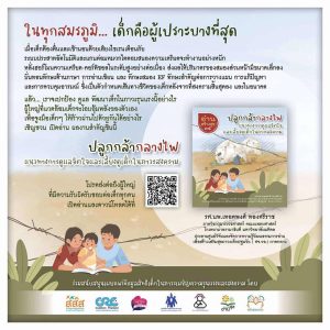 โดยนางสุดใจ พรหมเกิด ผู้จัดการแผนงานสร้างเสริมวัฒนธรรมการอ่าน สสส. และประธานมูลนิธิสร้างเสริมวัฒนธรรมการอ่าน กล่าวถึงความสำคัญของการใช้การอ่านใทีเพื่อสร้างเสริมสุขภาพเด็กที่ผ่านมา อาทิ สร้างสายสัมพันธ์และบ่มเพาะความเกื้อกูลระหว่างมนุษย์กับมนุษย์ เสริมพัฒนาการและศักยภาพเด็กปฐมวัย ป้องกันวิกฤติจากโรคหัดระบาด ลดการเสียชีวิตของเด็กในพื้นที่ชายแดนใต้ จึงเป็นที่มาของการรวบรวม เรียบเรียงงานวิชาการโดย นพ.เทอดพงศ์และคณะ ในเล่ม “ปลูกกล้ากลางไฟ ; แนวทางการดูแลจิตใจและเลี้ยงดูเด็กในภาวะสงคราม” เพื่อพ่อแม่ และหน่วยงานต่างๆ จะได้นำแนวทางไปประยุกต์ใช้ เมื่อเกิดวิกฤตต่างๆ